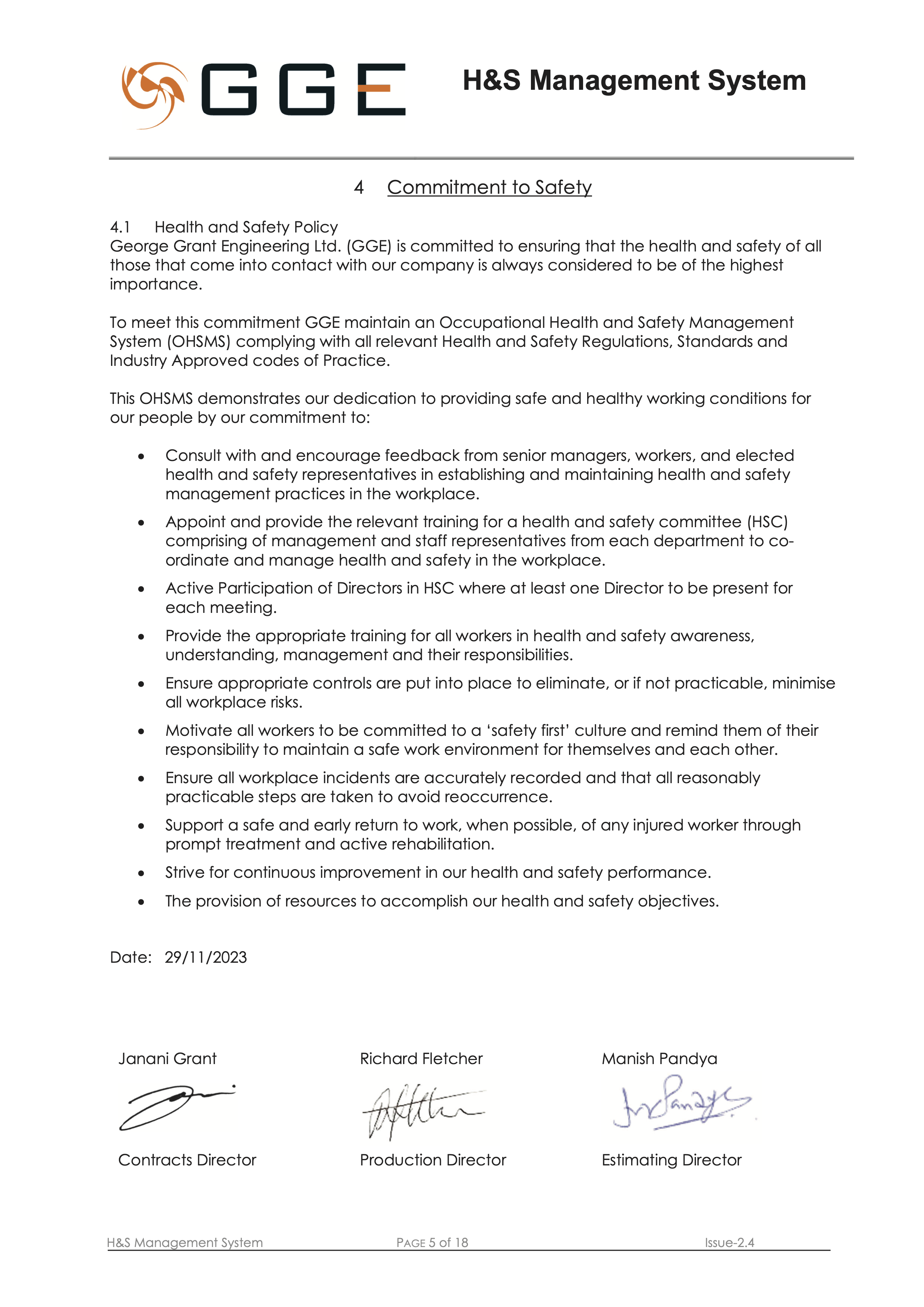 George Grant Engineering Ltd (GGE) is committed to maintaining safe and healthy working conditions for all employees, contractors, and visitors.